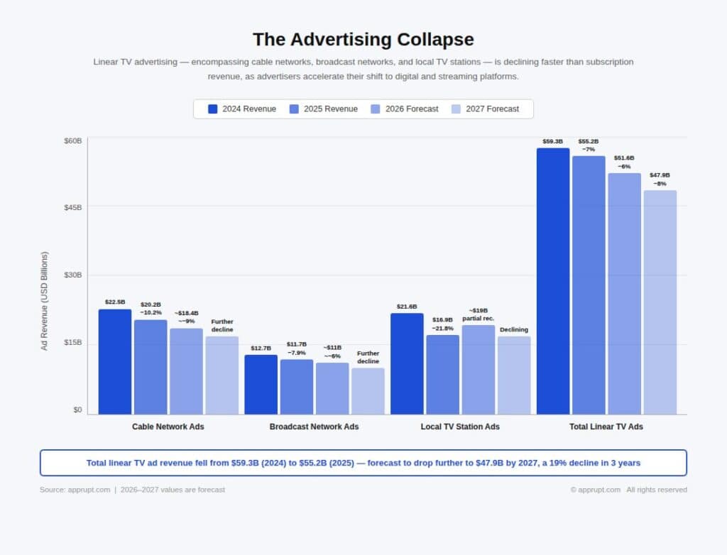 | Cable network ads | $20.2 billion | ~$16–17 billion | Declining ~9% annually |
