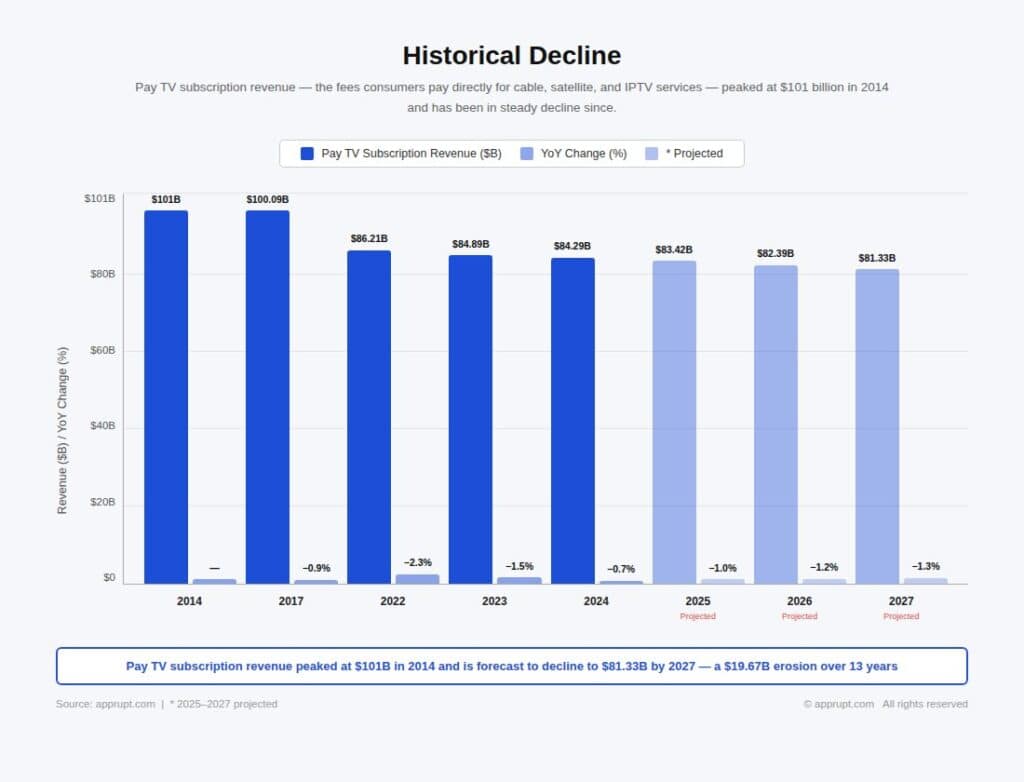 | Pay TV subscriptions | $83.4 billion | $53–81 billion | Declining 1–10% annually |