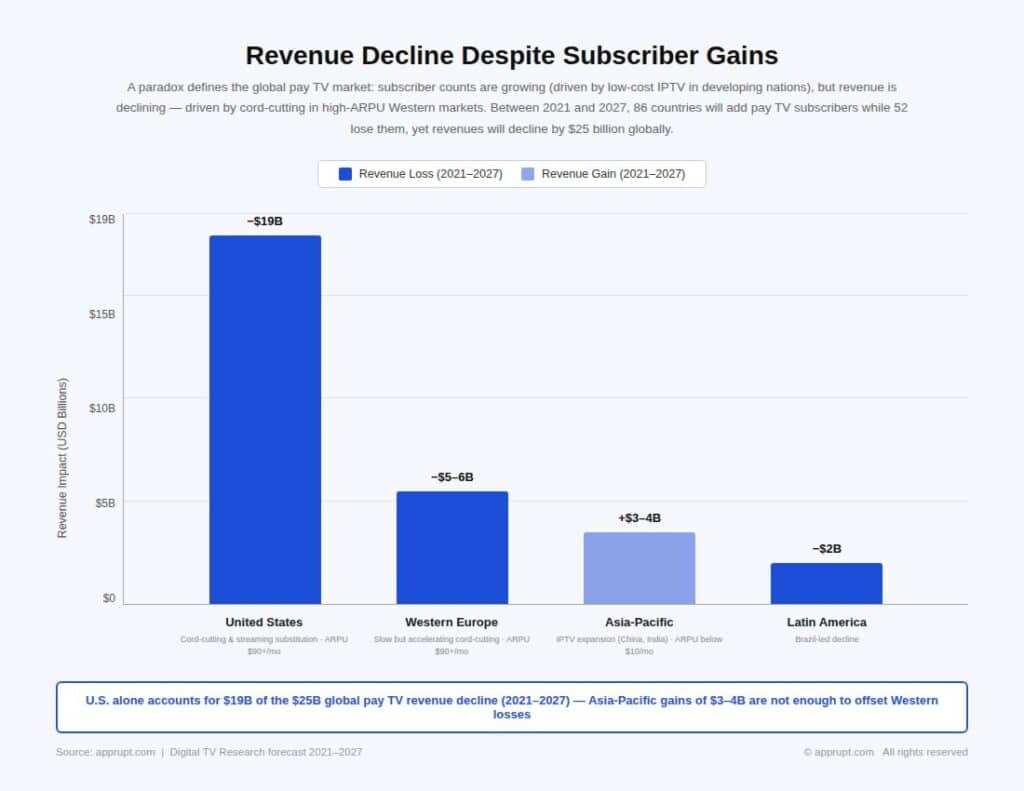 | Western Europe | −$5–6 billion | Slow but accelerating cord-cutting |