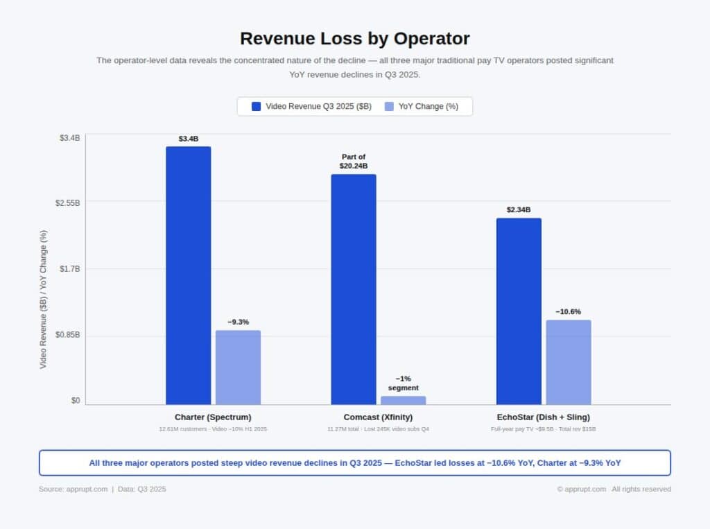| Charter (Spectrum) | $3.4 billion | −9.3% | Video revenue declined ~10% for H1; ended year with 12.61M customers |