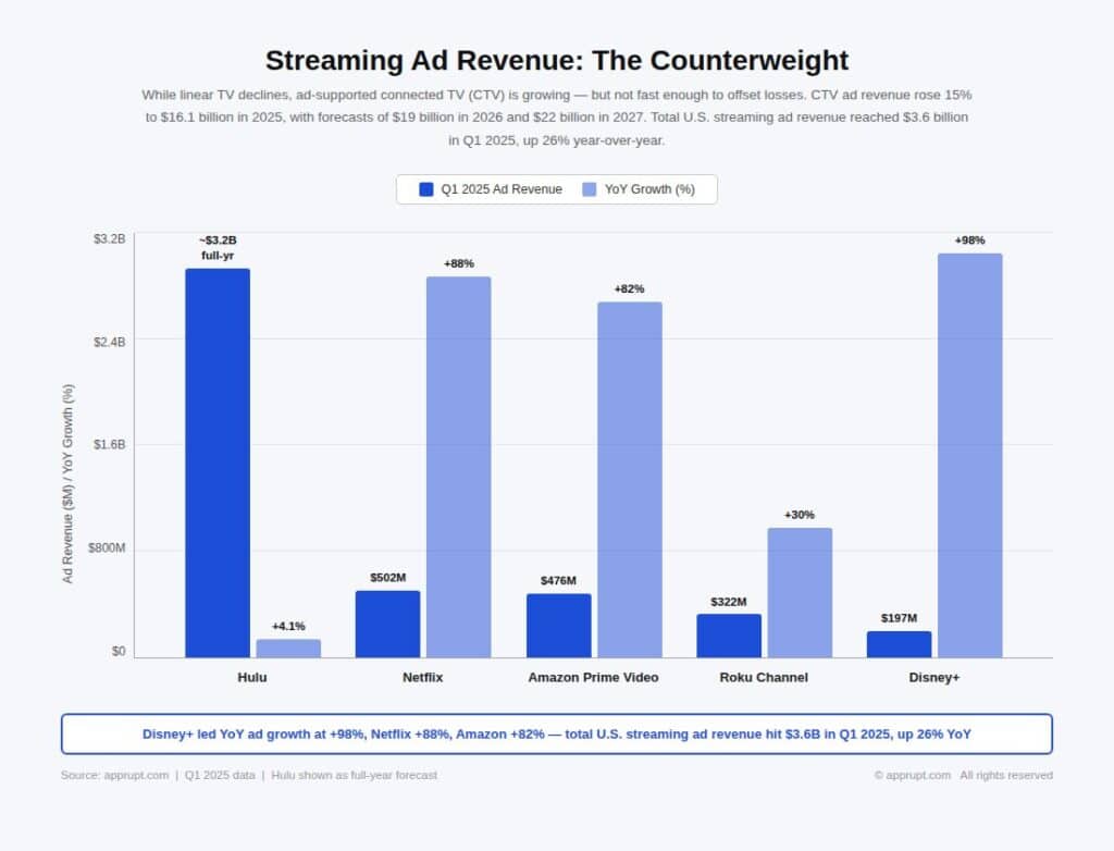 While linear declines, ad-supported connected TV (CTV) is growing — but not fast enough to offset losses. CTV ad revenue rose 15% to $16.1 billion in 2025, with forecasts of $19 billion in 2026 and $22 billion in 2027. Total U.S. streaming ad revenue reached $3.6 billion in Q1 2025, up 26% year-over-year.
