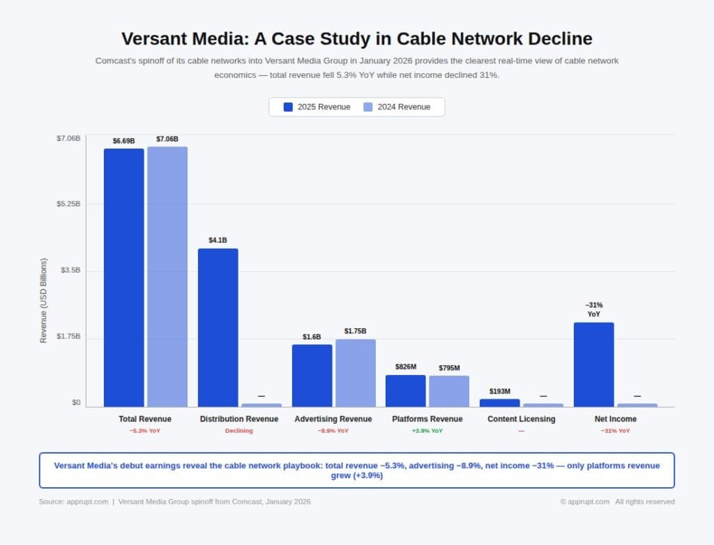 Comcast’s spinoff of its cable networks into Versant Media Group in January 2026 provides the clearest real-time view of cable network economics. Versant’s first earnings report revealed: