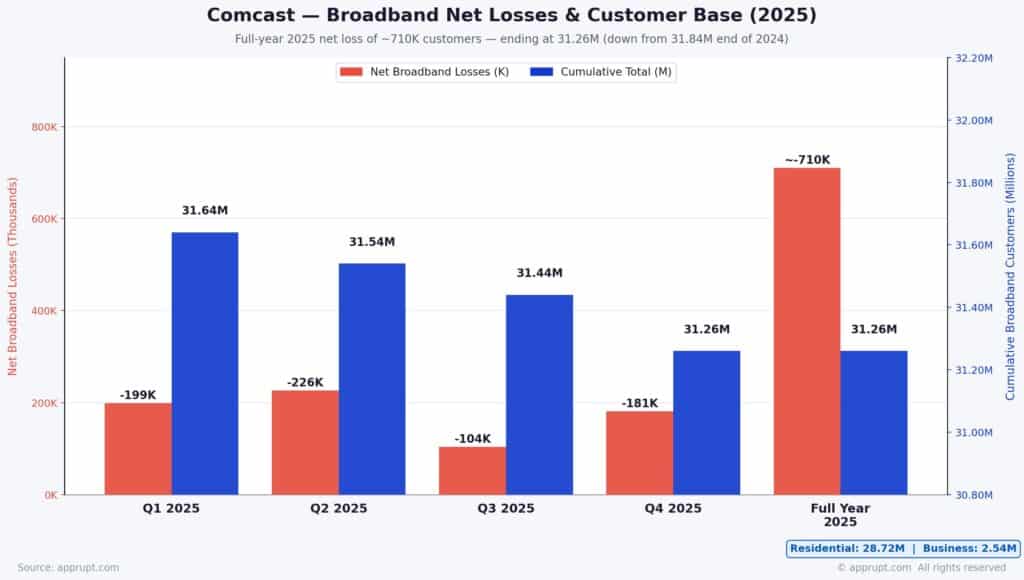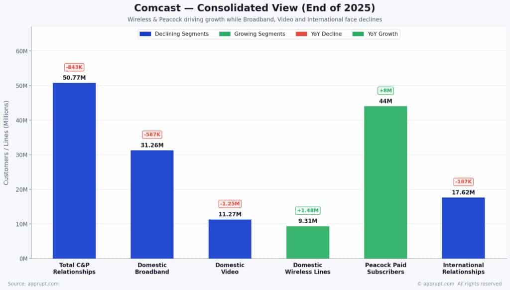 Comcast Corporation, the largest cable and broadband provider in the United States, ended 2025 with 50.77 million total customer relationships across its Connectivity & Platforms segment. The company faces a structural divergence: its legacy broadband and pay-TV businesses are steadily losing subscribers, while its wireless (Xfinity Mobile) and streaming (Peacock) divisions are experiencing strong growth. In 2025, Comcast lost roughly 587,000 domestic broadband customers and 1.25 million video subscribers, but added a record 1.5 million wireless lines and grew Peacock to 44 million paid subscribers. Analysts do not expect material broadband customer growth until 2027, making 2026 a pivotal transition year.