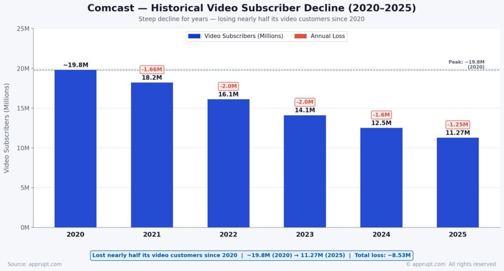 Comcast ended 2025 with 11.27 million domestic video customers, down from 12.52 million at the end of 2024 — a loss of 1.25 million in a single year. The quarterly losses in 2025: