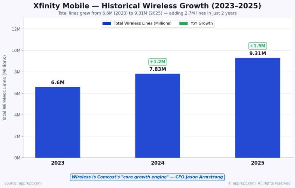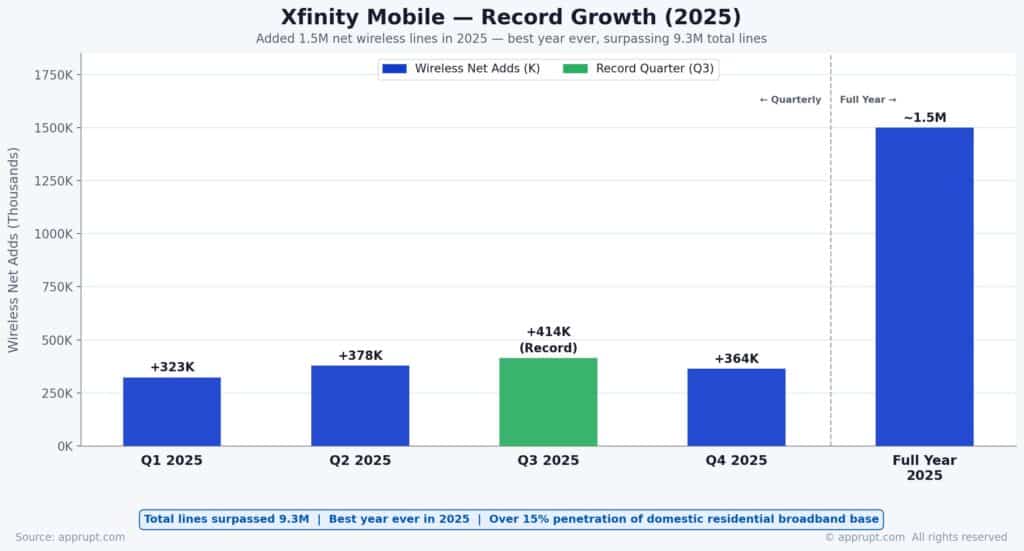 Xfinity Mobile delivered its best year ever in 2025, adding 1.5 million net wireless lines and surpassing 9.3 million total lines. This represents over 15% penetration of Comcast’s domestic residential broadband customer base.