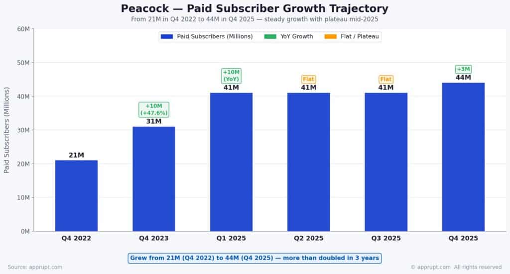 Peacock, NBCUniversal’s streaming platform, ended 2025 with 44 million paid subscribers, up 22% year-over-year from 36 million at the end of 2024. The growth was fueled by the debut of the NBA on NBC and Peacock, NFL Sunday Night Football, and original content.