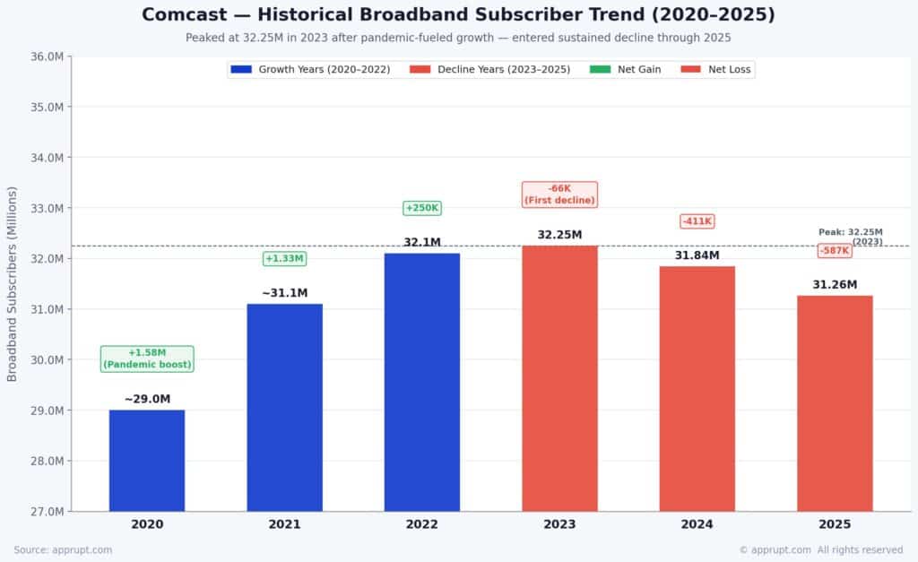 Comcast’s broadband subscriber count peaked in 2023 at 32.25 million after years of pandemic-fueled growth, then entered a sustained decline: