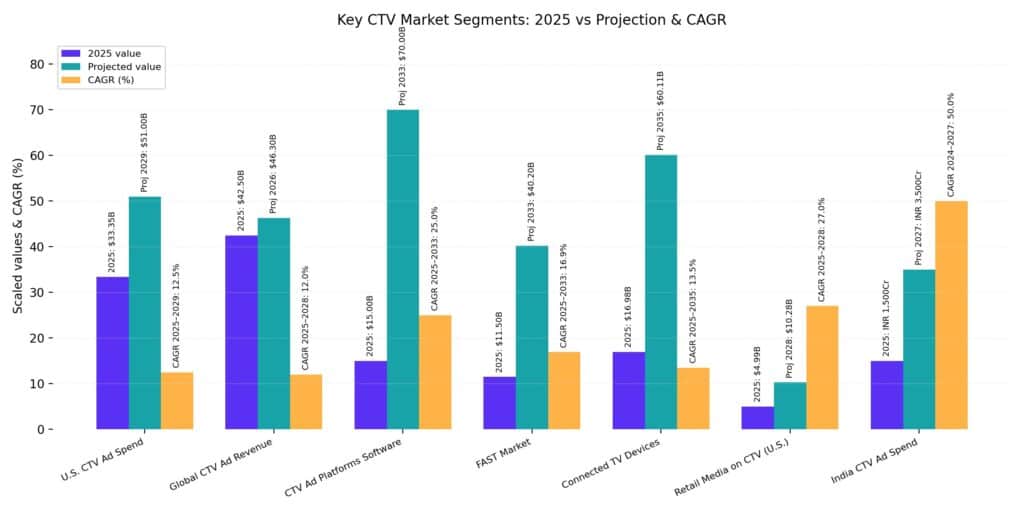 | Global CTV Ad Revenue | ~$40–45B | $46.3B (2026) | ~12% | 2025–2028 |