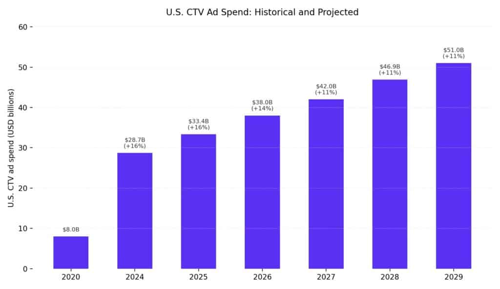 | U.S. CTV Ad Spend | $33.35B | ~$51B (2029) | 11–14% | 2025–2029 |