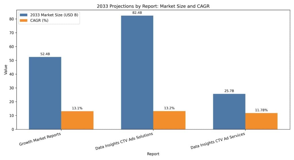 Growth Market Reports projects the Connected TV Advertising market to reach $52.4 billion by 2033 at a 13.1% CAGR, driven by cord-cutting, streaming adoption, and advances in ad targeting. Data Insights Market’s broader CTV Ads Solutions estimate reaches $82.4 billion by 2033 at a 13.2% CAGR. Meanwhile, CTV is projected to command over 40% of global ad spending by 2030, according to WARC, as linear TV’s share has already dropped to just 12%.
