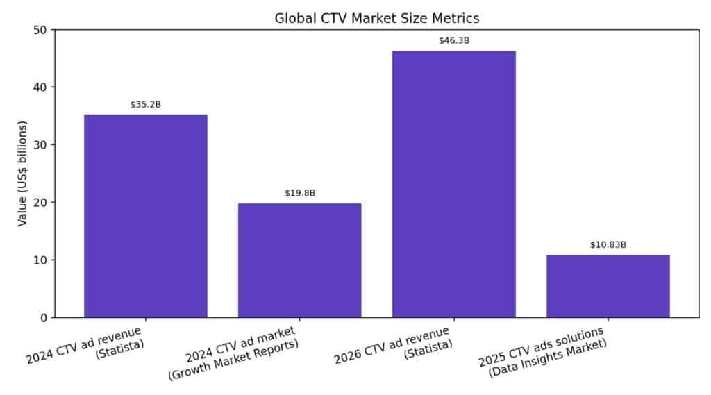 The variation reflects differences in scope — some estimates cover total CTV ad revenue globally (including platform and programmatic spend), while others focus specifically on CTV ad solutions or services. Statista’s broader measure of $35.2 billion in 2024 encompasses the full CTV ad revenue pie, whereas ad solutions-specific reports track a narrower segment.