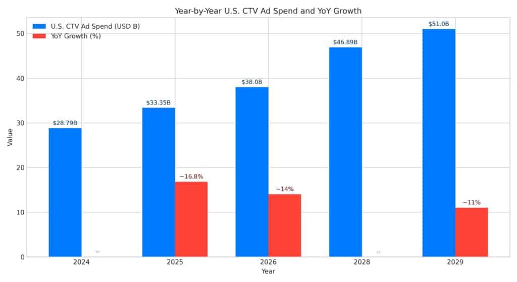 CTV ad spending in the U.S. reached $33.35 billion in 2025, marking roughly 16.8% year-over-year growth. By 2026, the market is expected to grow approximately 14% to reach $37.95–$38 billion. Growth rates are projected to ease from 14% in 2026 to around 11% by 2029, but the absolute dollar gains remain substantial — nearly $20 billion in new U.S. ad spend is anticipated over five years. By 2028, CTV is expected to surpass traditional TV advertising for the first time in history.