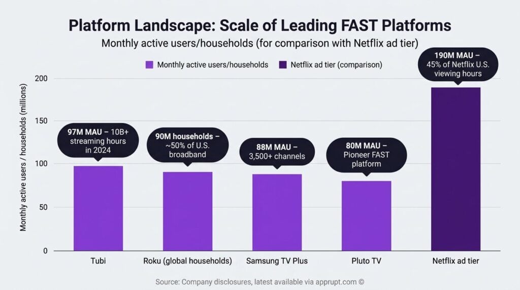 The leading FAST platforms have achieved scale that rivals or exceeds several paid streaming services: