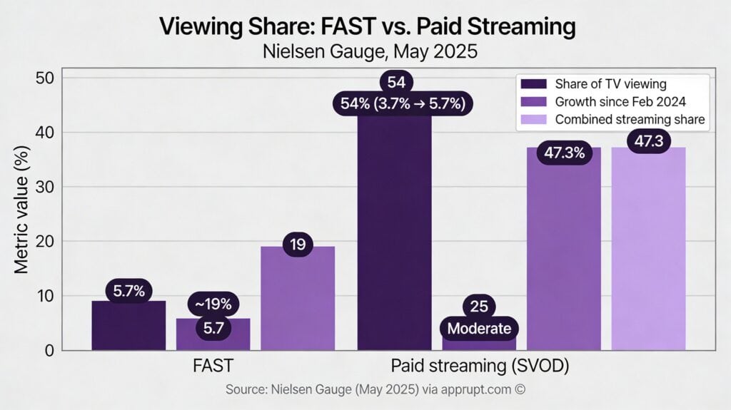 While FAST is growing rapidly, paid streaming still holds a larger share of total viewing time. According to Nielsen’s Gauge data from May 2025: