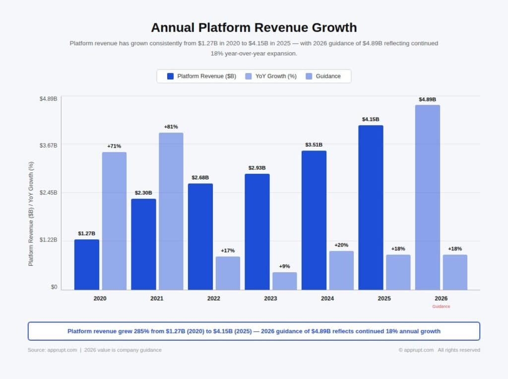 • Platform revenue guidance: $4.89 billion (18% growth), ahead of analysts’ $4.66 billion estimate.