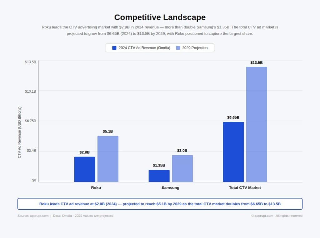 Roku’s estimated share of the total CTV advertising market was approximately $2.8 billion out of $6.65 billion in platform-level CTV ad revenue in 2024 (per Omdia’s narrower CTV platform market definition), representing roughly 42% market share at the platform level. Samsung ranked second at $1.35 billion.