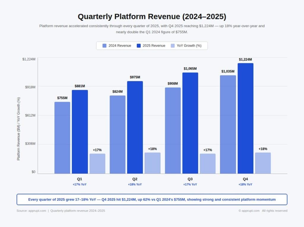 Q4 2025 platform revenue of $1.224 billion was the highest ever, exceeding the analyst estimate of $1.18 billion. Platform gross margin held at approximately 52.8% in Q4, with full-year platform gross profit reaching roughly $2.14 billion.