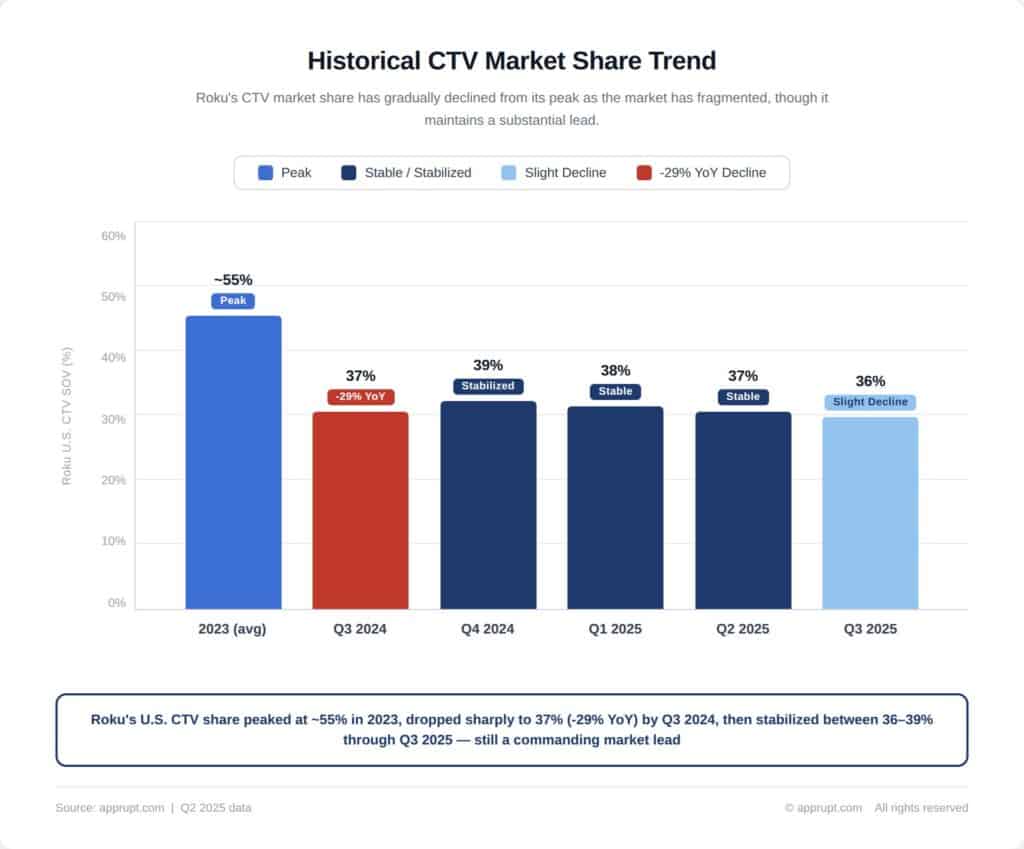 Roku’s CTV market share has gradually declined from its peak as the market has fragmented, though it maintains a substantial lead.