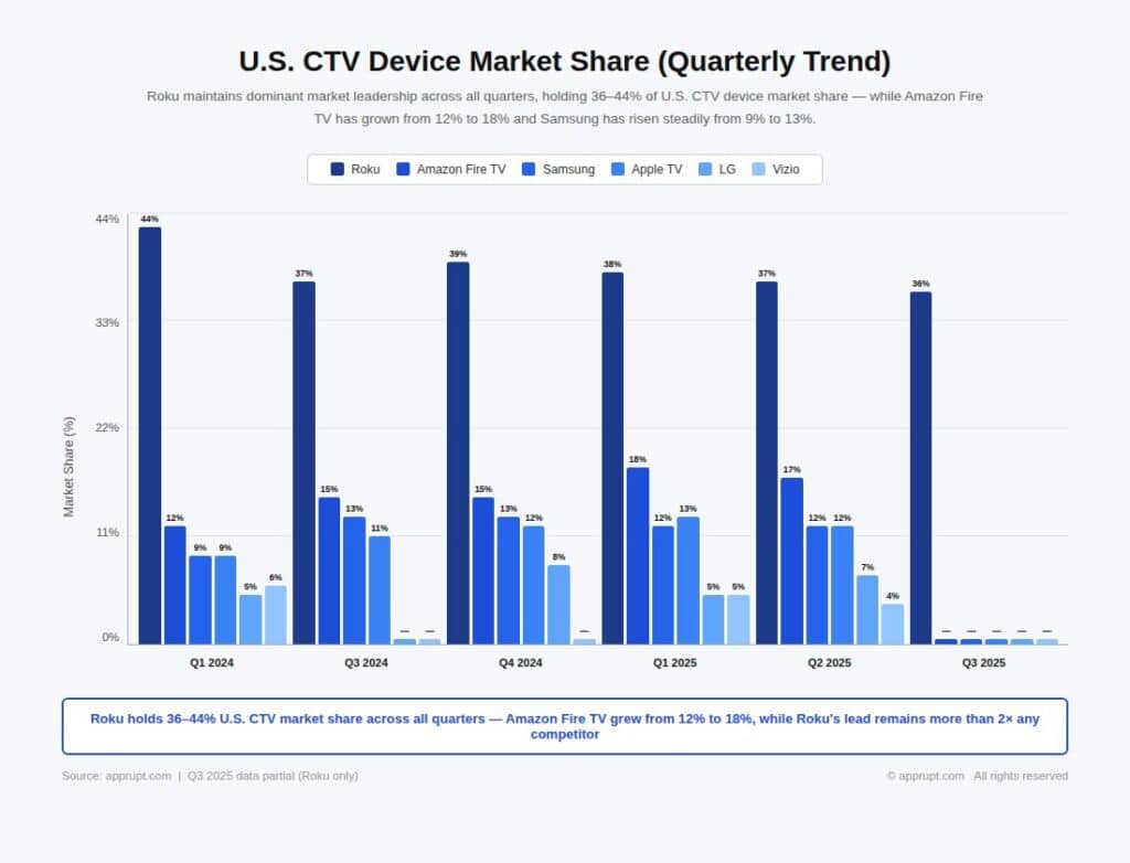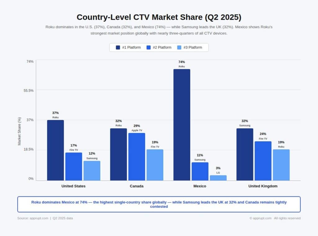 Roku’s most dominant single-country market is Mexico, where it commands an extraordinary 74% CTV device market share. In North America as a whole, Roku’s share stabilized at 36–37% throughout Q2–Q3 2025 after declining from 44% in Q1 2024.