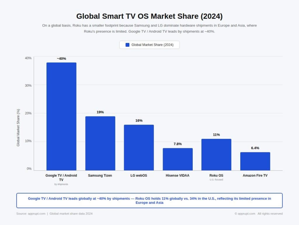 - Google TV/Android TV’s global dominance: At ~40% of global shipments, Android TV remains the largest platform worldwide.