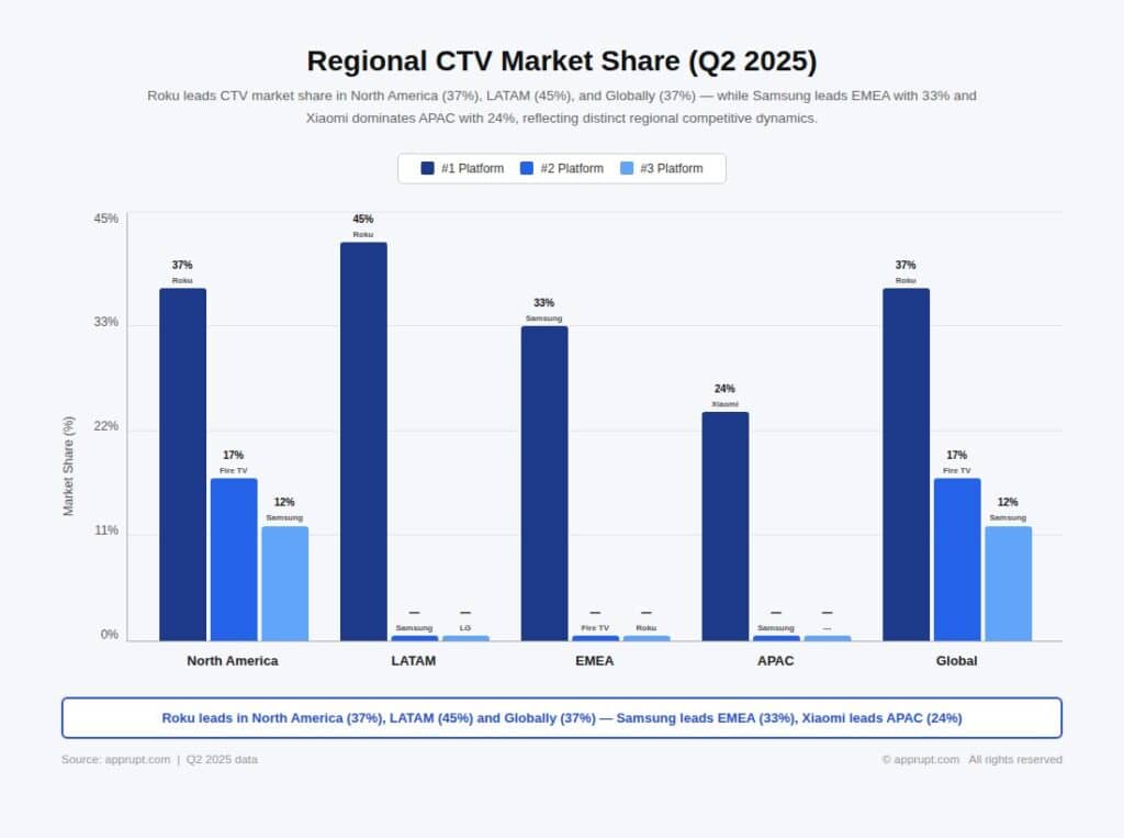 | North America | Roku | 37% | Amazon Fire TV | 17% | Samsung | 12% |