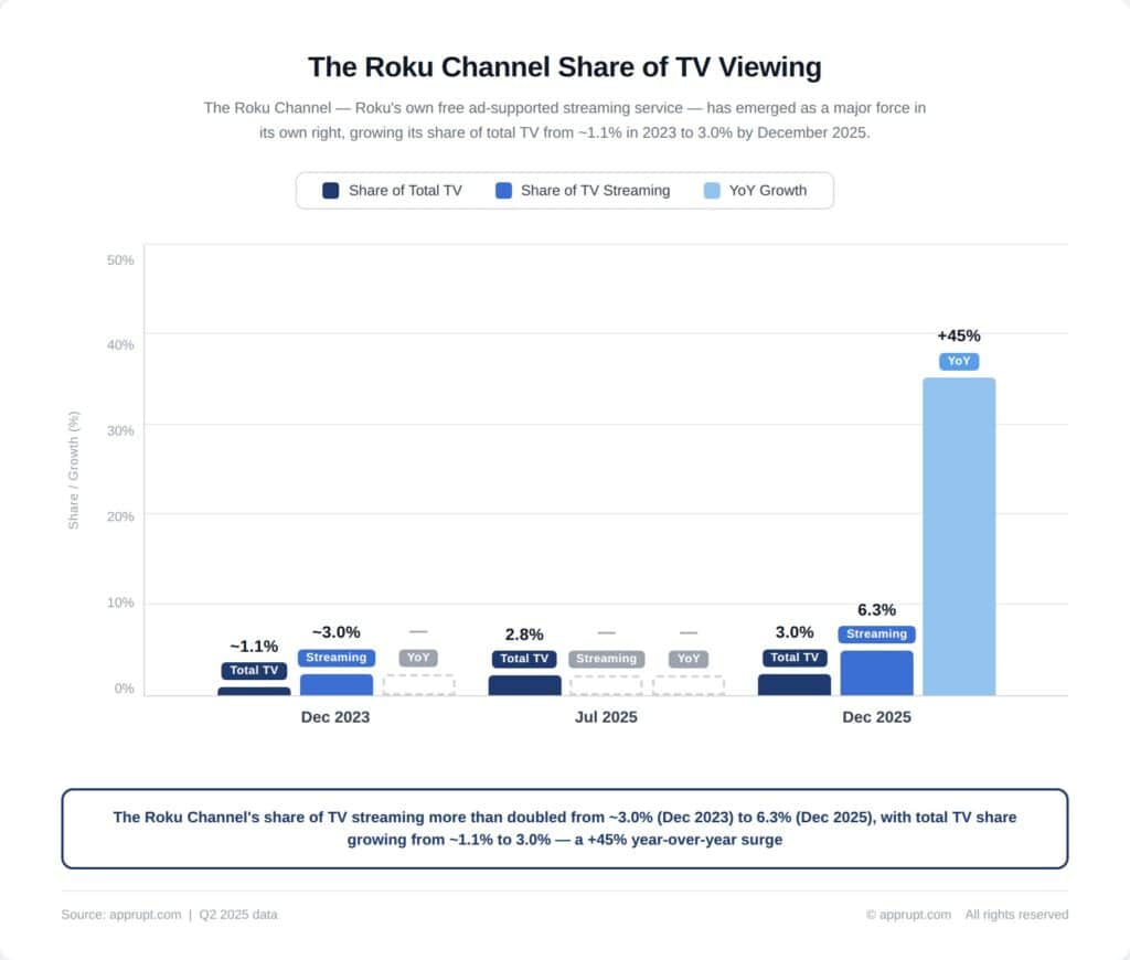 The Roku Channel’s 3% share of all U.S. TV viewership in December 2025 makes it larger than Paramount+ and Pluto TV combined (2.5%), Tubi (2%), Peacock (1.7%), and WBD’s HBO Max/Discovery+ (1.4%). Only Netflix (9%), YouTube (12.7%), Disney family (4.7%), and Prime Video (4.3%) have larger shares. The Roku Channel is the fastest-growing streaming service on Nielsen’s Gauge, with its share of TV time up 190% compared to two years prior.