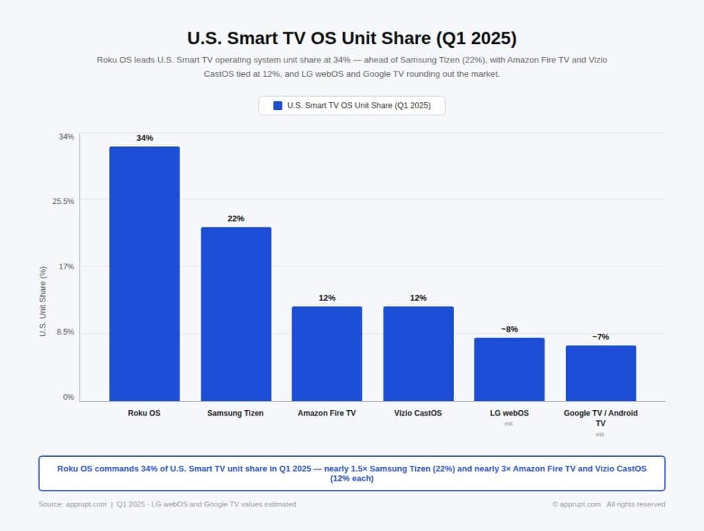 Roku has held the leading TV OS unit market share in the U.S. for most of the last six years, according to Omdia. Its Q1 2025 share of 34% means Roku sells more smart TV units than the next two TV operating systems (Samsung Tizen at 22% and Amazon Fire TV / Vizio CastOS at 12% each) combined. This claim was reiterated by Roku itself: “In the U.S., Roku TV unit sales are greater than the next two TV operating systems combined”.