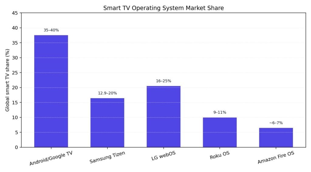 | Amazon Fire OS | ~6–7% | Expanding into smart TV manufacturing |