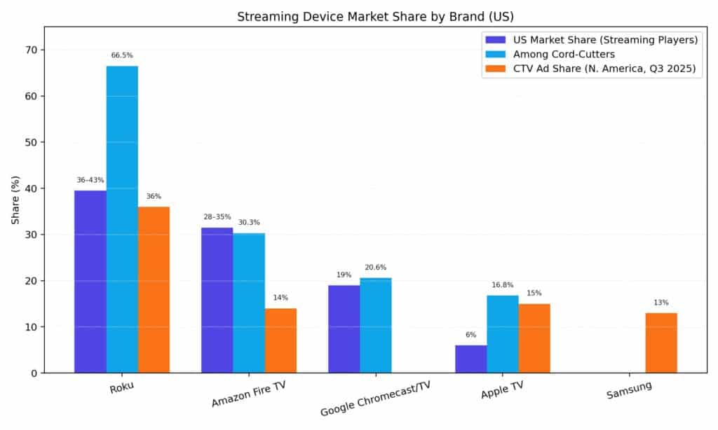 | Brand | US Market Share (Streaming Players) | Among Cord-Cutters | CTV Ad Share (N. America, Q3 2025) |