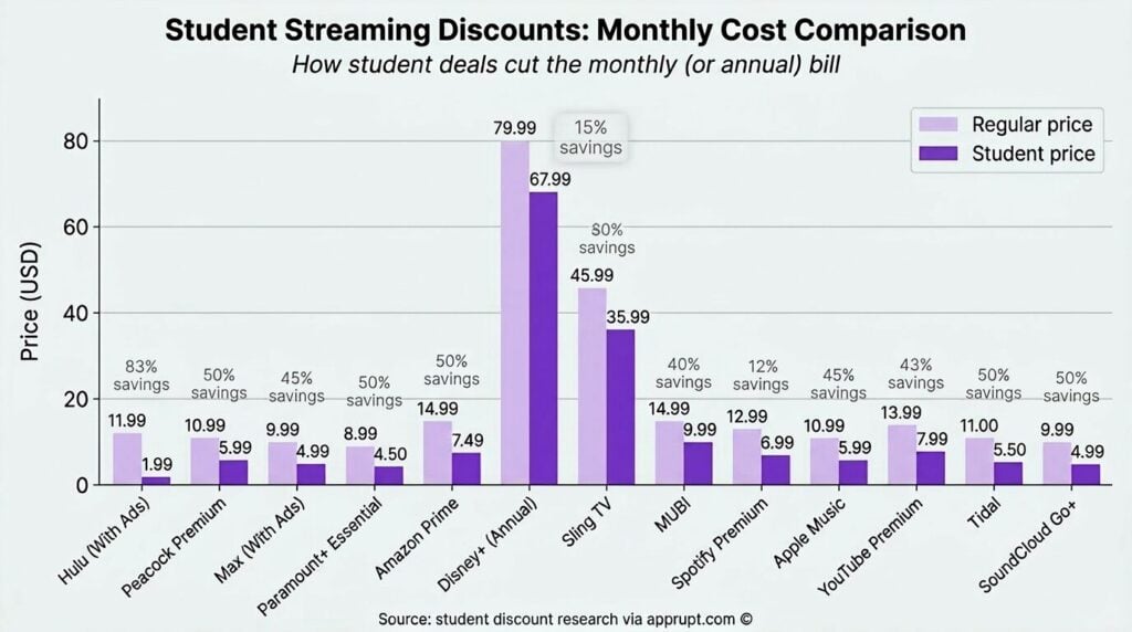 Students seeking maximum value should consider combining discounts strategically. Spotify Premium Student at $6.99/month bundles both Spotify and Hulu (With Ads), which alone would cost nearly $25/month at full price. Similarly, Apple Music’s student plan at $5.99/month includes Apple TV+, effectively offering two services for the price of one discounted subscription. For comprehensive video streaming, pairing Hulu’s standalone student deal ($1.99/month) with Peacock ($5.99/month) and Paramount+ ($4.50/month) yields three major platforms for under $13/month total — less than the cost of a single standard Netflix subscription.