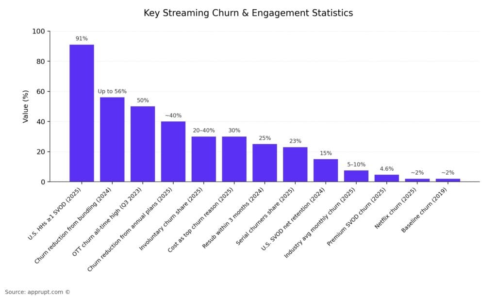 | Video streaming monthly churn (industry avg.) | 5–10% | 2025 |