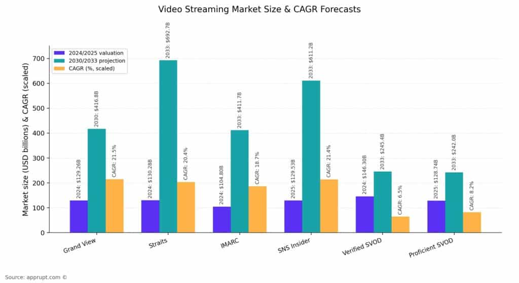 | Video streaming market (2033 est.) | $242B–$693B | Projected |