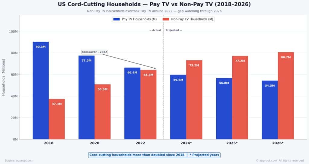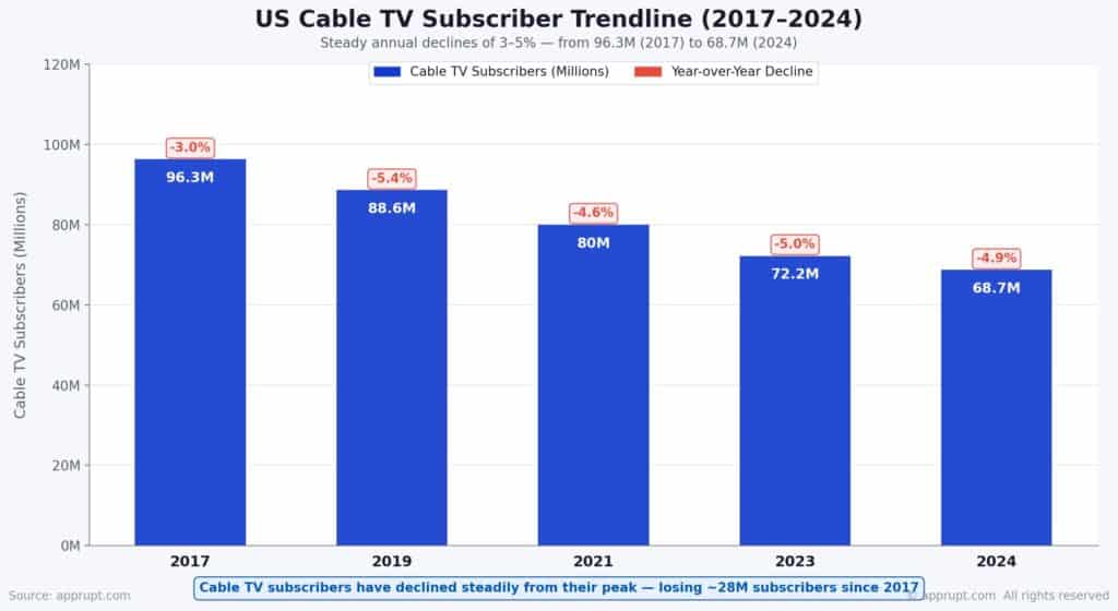 Pay TV penetration has collapsed from its 2010 peak of 88% to approximately 50% by the end of 2025. The trajectory continues downward: