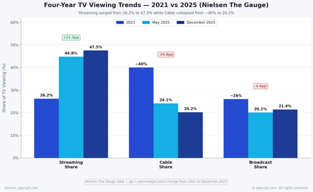 In May 2025, streaming captured 44.8% of all TV viewing, surpassing the combined viewership of broadcast (20.1%) and cable (24.1%) for the first time in history, according to Nielsen’s monthly report, The Gauge. By December 2025, streaming’s share surged to 47.5%, while cable plummeted to a record low of 20.2% and broadcast held at 21.4%.