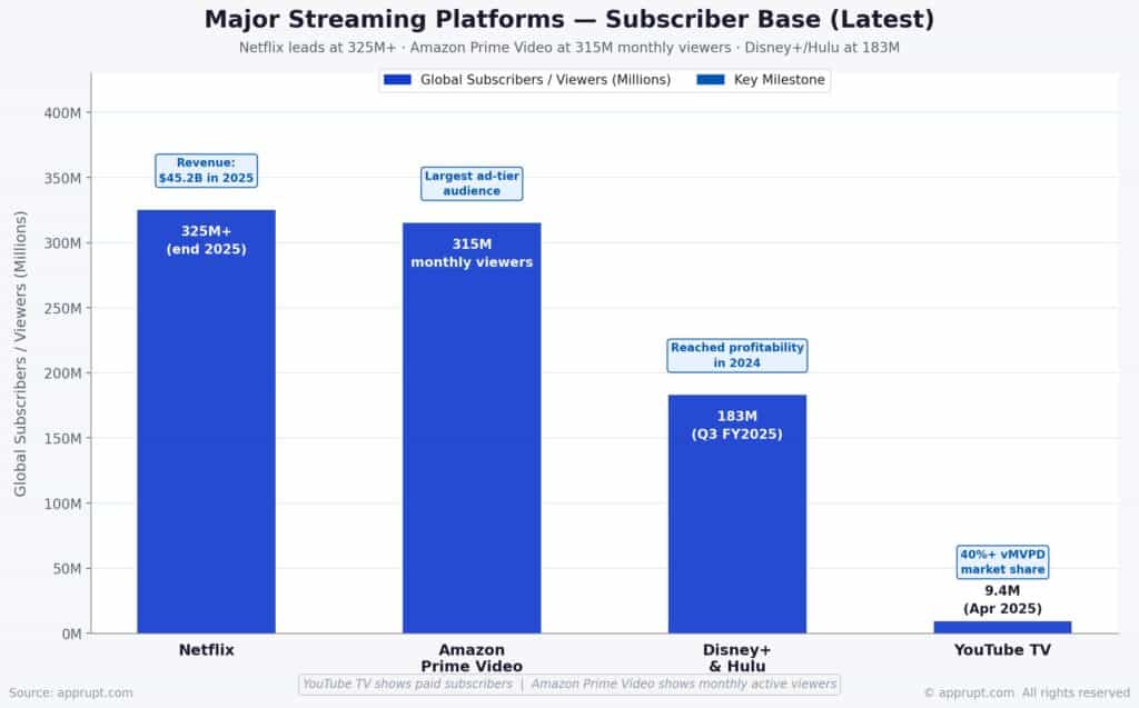 Netflix remains the global leader, with its subscriber base growing 8.6% year-over-year from 301.6 million to 327.7 million by Q4 2025. The company plans to invest $20 billion in content for 2026. YouTube TV is forecasted to become the largest pay-TV distributor in the U.S. by end of 2026, potentially reaching 12.4 million subscribers.