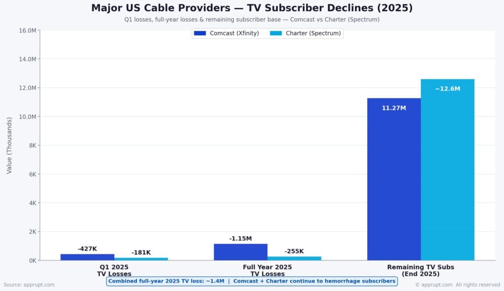 Comcast lost 245,000 pay TV customers in Q4 2025 alone, bringing its rate of loss to roughly 3,500 TV customers per day. Over the full year 2025, Comcast and Charter collectively lost over 1.3 million pay-TV customers in the first three quarters, with additional losses in Q4.