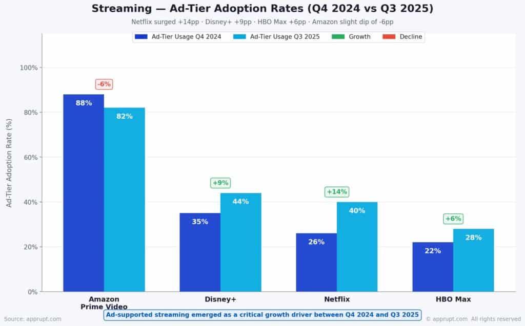 Ad-supported streaming has emerged as a critical growth driver. The share of subscribers on ad-supported tiers grew substantially between Q4 2024 and Q3 2025: