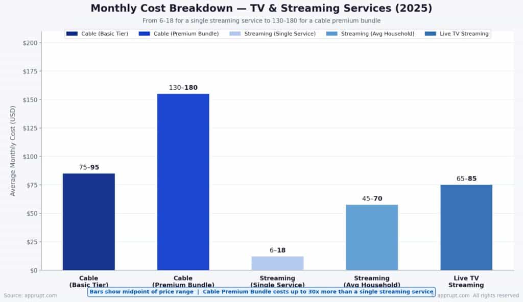 The average American household spends approximately $52 per month on streaming subscriptions, according to a 2025 survey of 1,000 Americans. However, streaming costs are rising — U.S. viewers now pay an average of $69 per month for four streaming services, up 13% from the prior year. Despite this, cord-cutters still generally pay less than cable subscribers, and 86.7% of cord-cutters cite high cable prices as their primary motivation for switching.