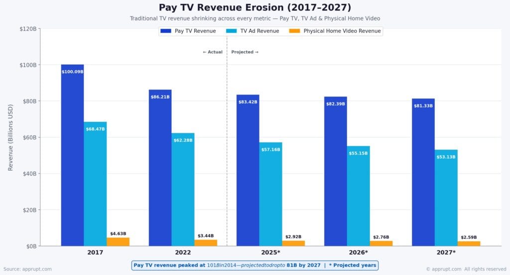 Traditional TV revenue is shrinking across every metric. Pay TV revenue peaked at $101 billion in 2014 and is projected to drop to approximately $53 billion by 2027 — a $48 billion decline.