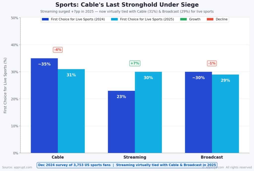 Live sports have historically anchored cable subscriptions, but streaming is rapidly closing this gap. A December 2024 survey of 3,753 U.S. sports fans found that streaming is now virtually tied with cable and broadcast as the preferred platform for live sports: