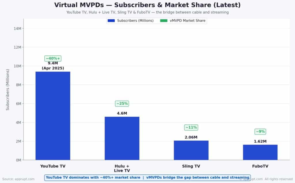 YouTube TV9.4 million (April 2025)40%+ vMVPD market share