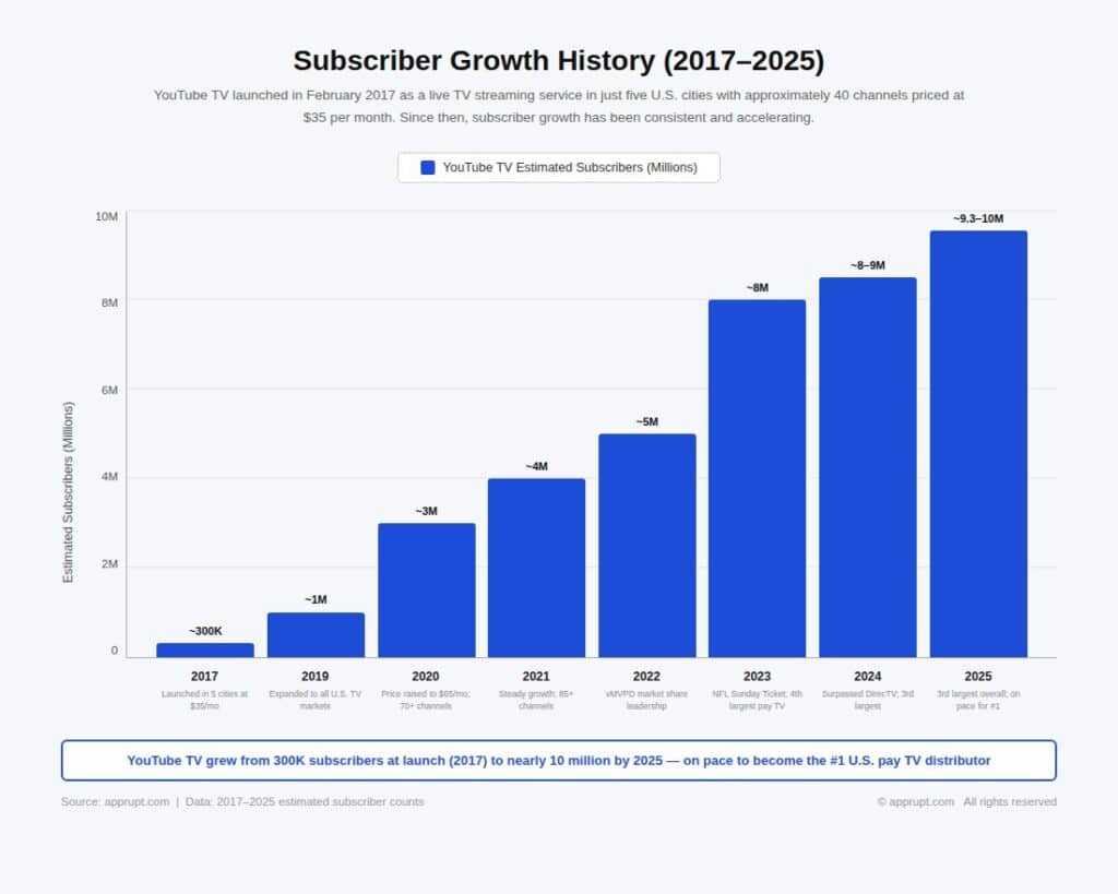 YouTube TV achieved a 35% year-over-year subscriber growth rate in 2023, adding approximately 3 million subscribers since mid-2022. Google confirmed YouTube TV was its “fastest-growing product” in 2023. By April 2025, the platform had 9.4 million subscribers, and by November 2025, multiple sources reported the 10 million subscriber milestone had been reached or nearly reached.