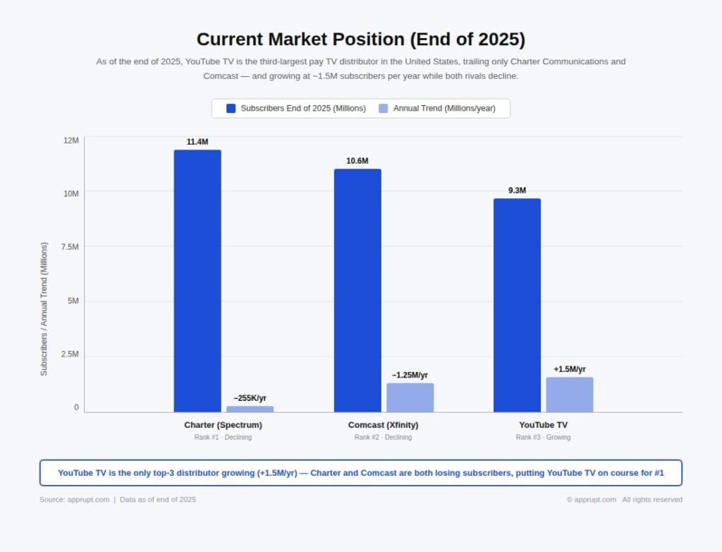 YouTube TV’s trajectory points toward a fundamental restructuring of the U.S. pay TV market. The service is virtually certain to become the #1 pay TV distributor in the U.S. by 2027 at the latest, with a subscriber base of 10–12 million. The gap will widen as Charter and Comcast continue shedding approximately 5–7% of their video subscribers annually.