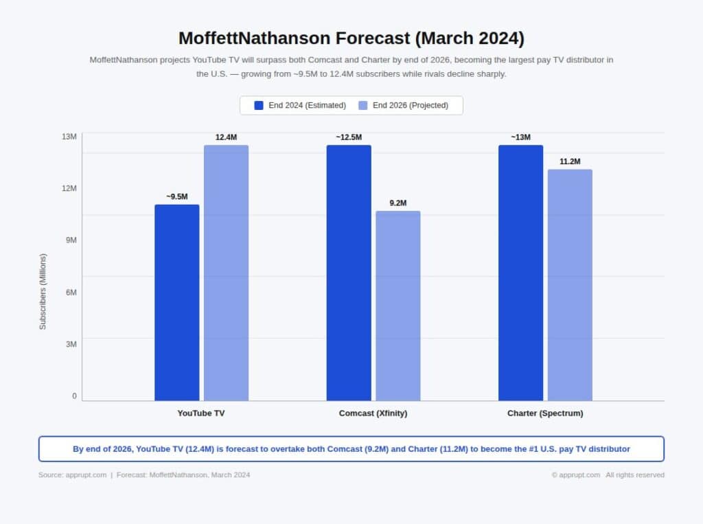 MoffettNathanson projected YouTube TV would reach 12.4 million subscribers by the end of 2026, adding roughly 1.5 million per year. At that point, it would surpass both Comcast (projected at 9.2 million) and Charter (11.2 million) as the largest pay TV operator.