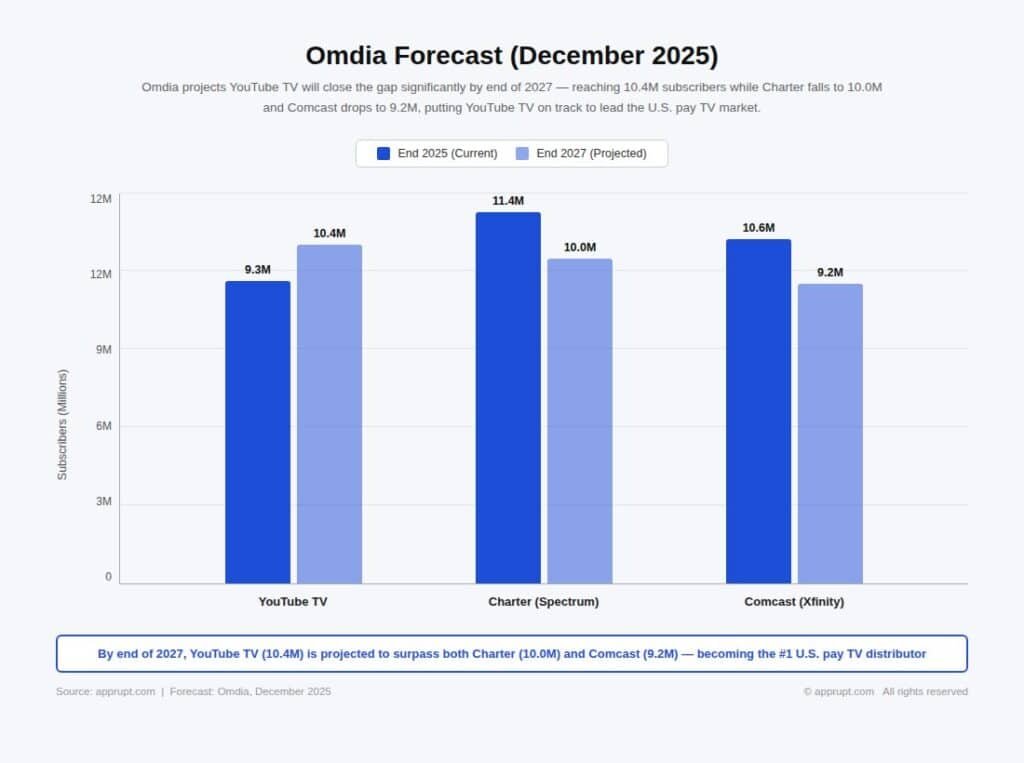 Omdia’s more conservative forecast, issued in December 2025, projects YouTube TV will reach 10.4 million subscribers by 2027 — enough to overtake both Charter and Comcast for the first time. “For the first time in U.S. television history, the largest pay-TV operator will be a virtual provider,” said Maria Rua Aguete, head of media and entertainment at Omdia.