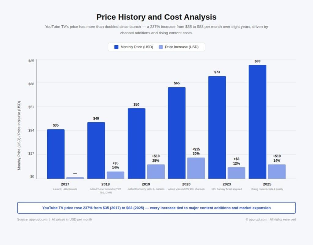 YouTube TV’s price has more than doubled since launch — a 237% increase from $35 to $83 per month over eight years.