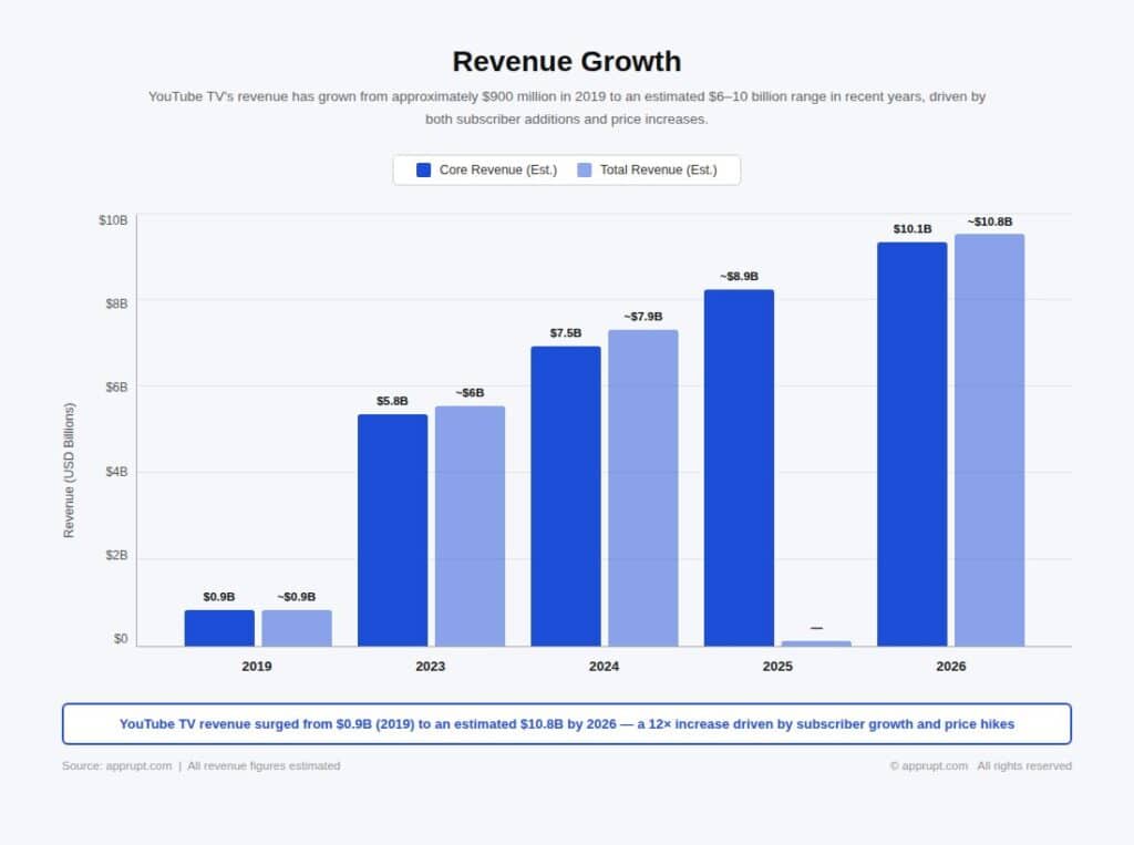 YouTube TV’s revenue has grown from approximately $900 million in 2019 to an estimated $6–10 billion range in recent years, driven by both subscriber additions and price increases.