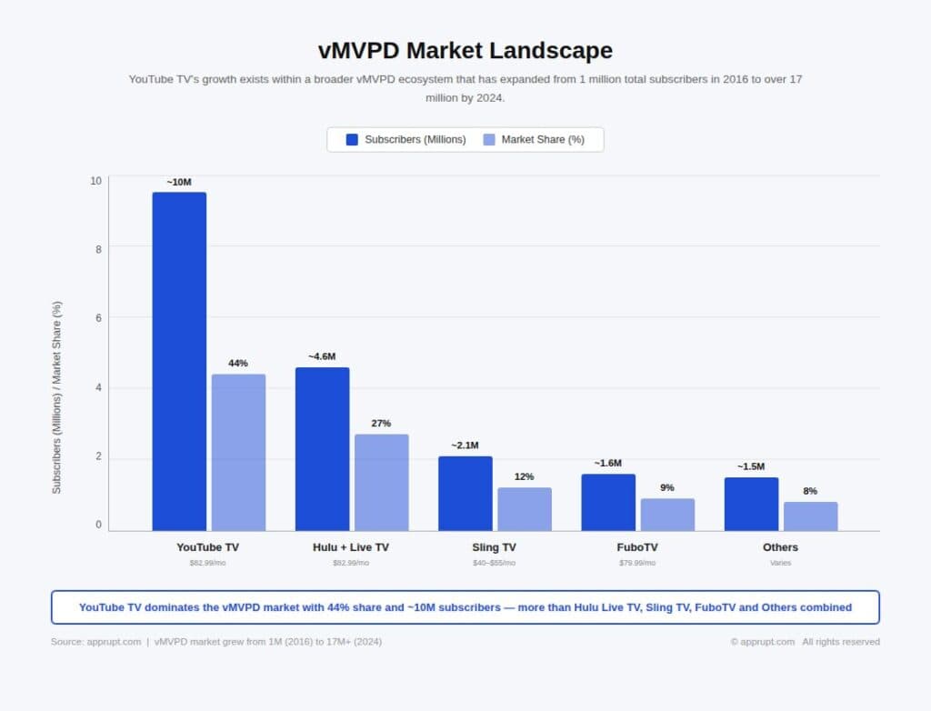 YouTube TV’s growth exists within a broader vMVPD ecosystem that has expanded from 1 million total subscribers in 2016 to over 17 million by 2024.